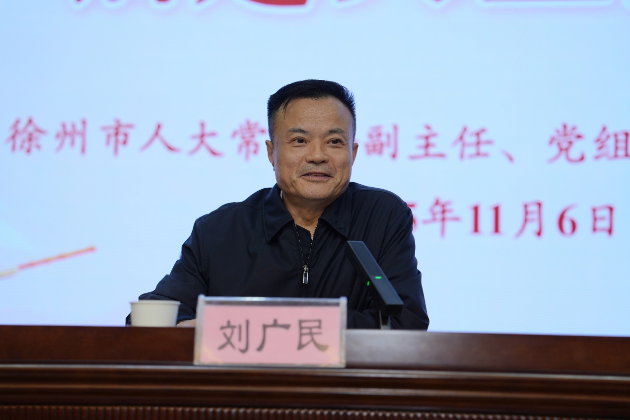 为深入学习贯彻党的二十届四中全会精神及习近平总书记关于加强高校思政课建设的重要指示精神,扎实推动领导干部讲思政课机制落地见效,11月6日,徐州市人大常委会副主任、党组副书记、一级巡视员刘广民以《在时代浪潮中锚定人生航向》为题,为我校师生讲授了一堂兼具理论深度、实践温度与时代高度的专题思政课。本次活动由我校党委副书记、校长张军主持,校党委副书记谭红玲,校党委委员、副校长赵虎,校党委委员、宣传部部长王冬,相关部门负责人和120余名师生代表现场聆听授课。